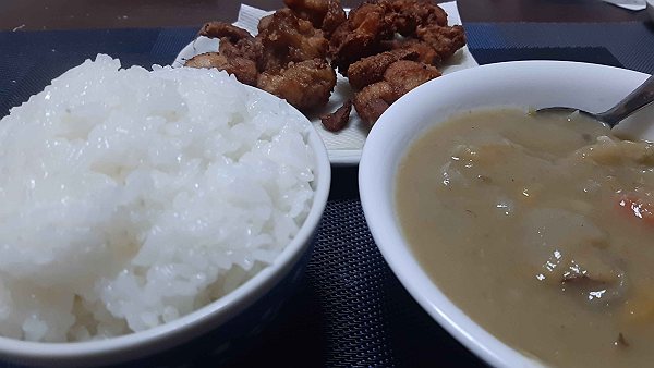 夜は唐揚げ、昨日のシチューを食べました。
