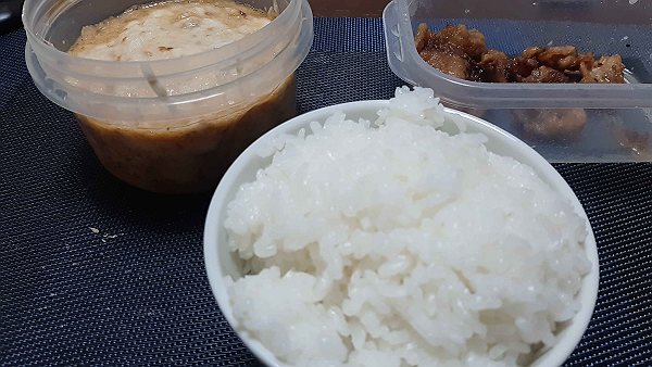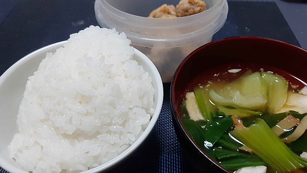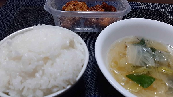 夜は昨日の唐揚げ、スープを食べました。