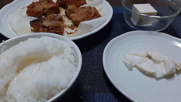 夜はカツ、冷奴、かぶの漬物を食べました。