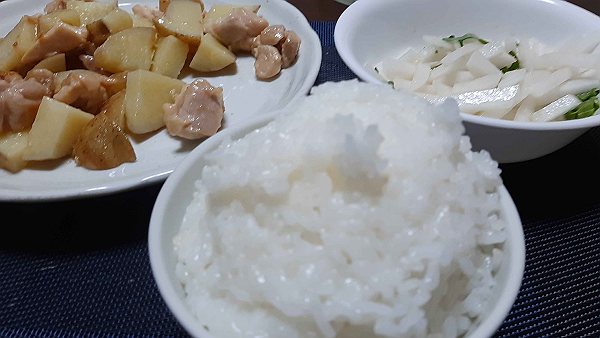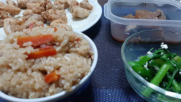 夜は唐揚げ、春菊の白和え、炊き込みご飯、昨日のぶり大根を食べました。