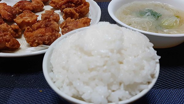 夜は唐揚げ (だしの素と醤油)、春雨と大根と白菜とチンゲン菜のコンソメスープを作って食べました。
