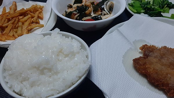 夜はフライドポテト、中華サラダ、チンゲン菜の炒め、かつを作って食べました。