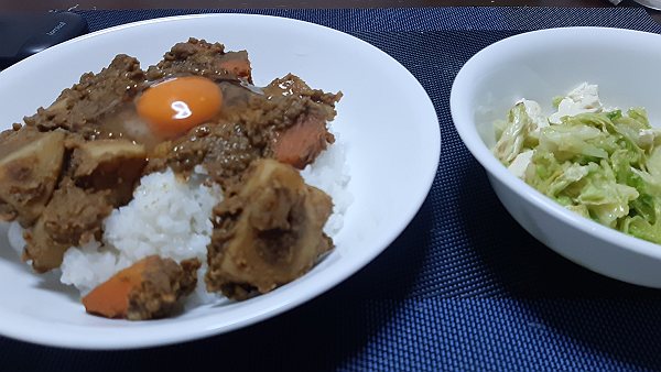 夜は昨日のカレーに生卵を乗せてみて、白菜と豆腐の炒めを作って食べました。