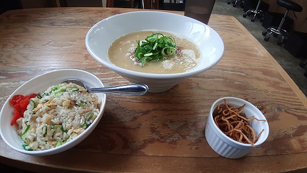 白湯ラーメンの半チャーハンセット、揚げラーメン(無料)、990円でした。
