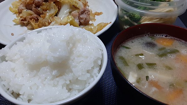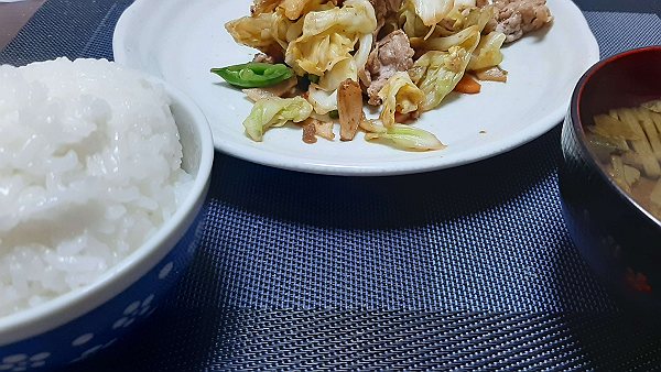 夜はキャベツと豚肉の炒め、昨日のスパゲッティサラダ、昨日の豚汁を食べました。