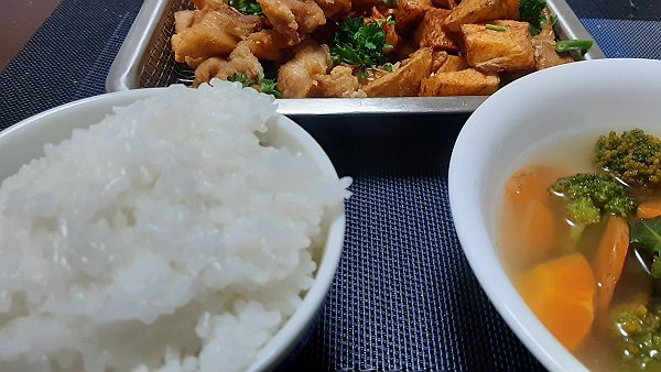 夜は唐揚げ、フライドポテト、コンソメスープを作って食べました。