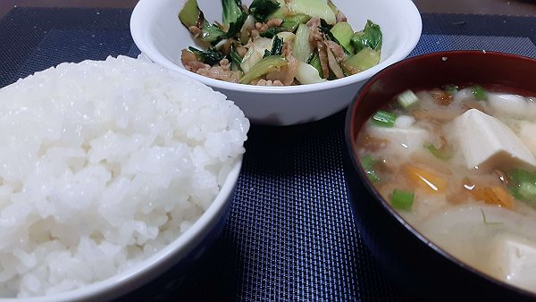 夜はチンゲン菜と豚肉と菊芋の炒め、味噌汁を作って食べました。