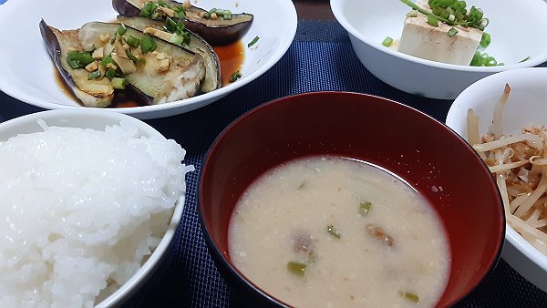 夜はナスびたし、冷奴、もやしと豚肉の炒め、味噌汁を食べました。