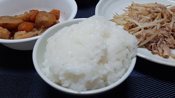 夜は昨日の肉じゃが、もやしと豚肉の炒めを作って食べました。