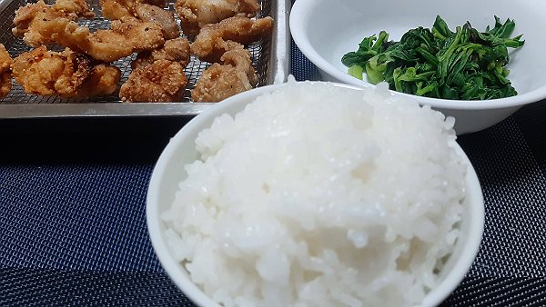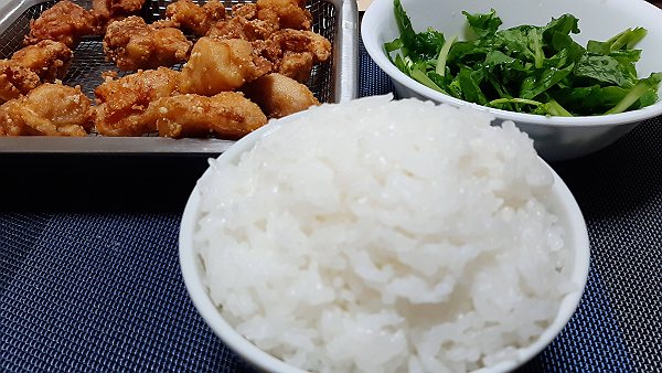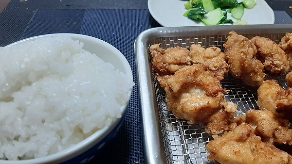 夜は唐揚げ、チンゲン菜の炒めを作って食べました。