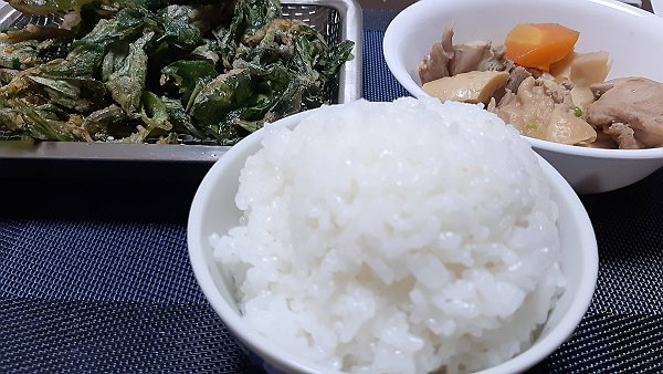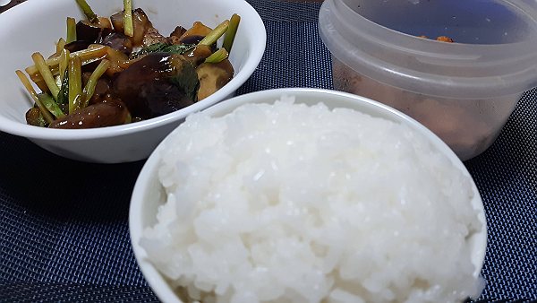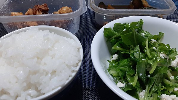 夜はナスと小松菜の甘酢炒め、昨日の唐揚げを食べました。、