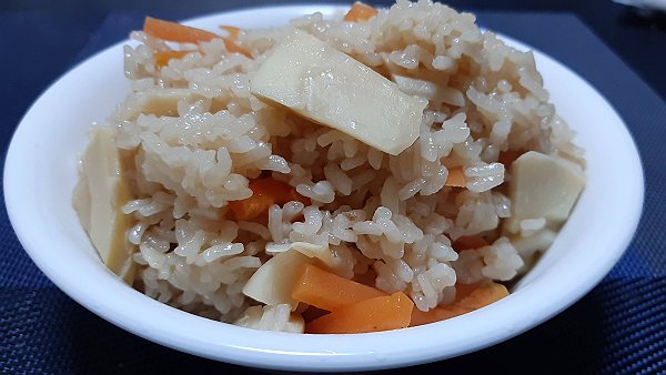 夜はたけのことにんじんの炊き込みご飯を作って食べました。