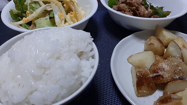 夜はじゃがいも蒸し炒め、豚肉とピーマンとにんにく炒め、卵サラダを作って食べました。