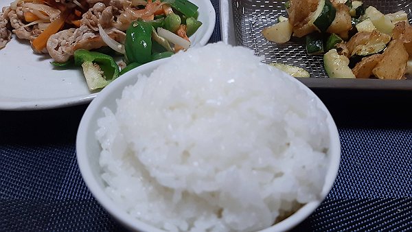 夜はじゃがいもとズッキーニの揚げ、豚肉とピーマンとにんじんとたまねぎの炒めを作って食べました。