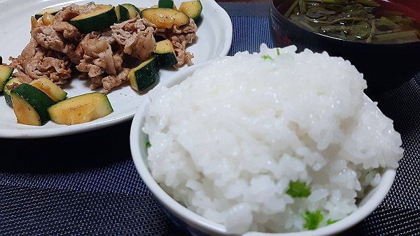 夜はズッキーニと豚肉の炒め、せりとわかめのお吸い物を作って食べました。