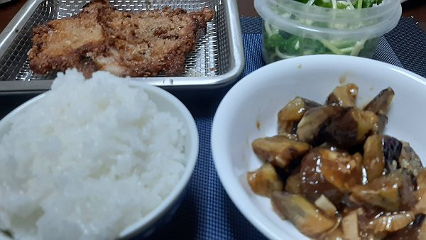 夜はかつ、ナスの炒め、スパゲッティサラダを食べました。