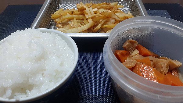 夜はフライドポテト、昨日の煮物を食べました。