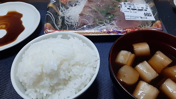 夜は天然ぶりの刺身、麩とふのりとチンゲン菜のお吸い物、昨日のフライドポテトを食べました。