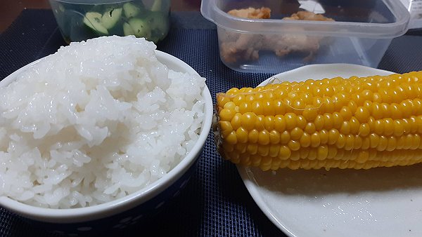 夜はとうもろこし、昨日の唐揚げときゅうりを食べました。
