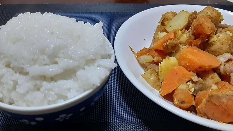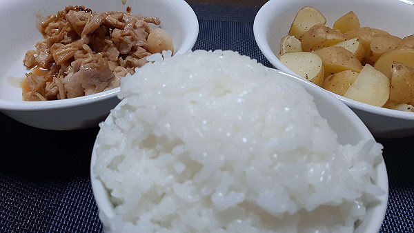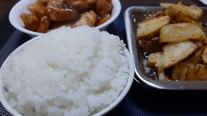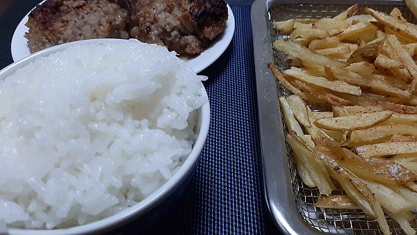夜は胸肉の甘辛煮、フライドポテトを食べました。甘辛にしない方が良かったかもと思いました。