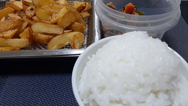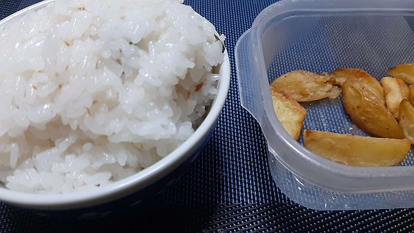 夜は梅と紫蘇のご飯、昨日のフライドポテトを食べました。