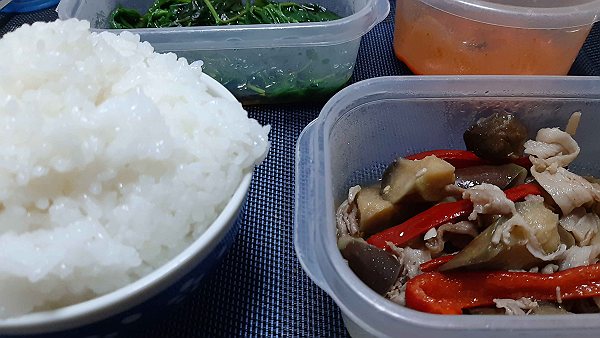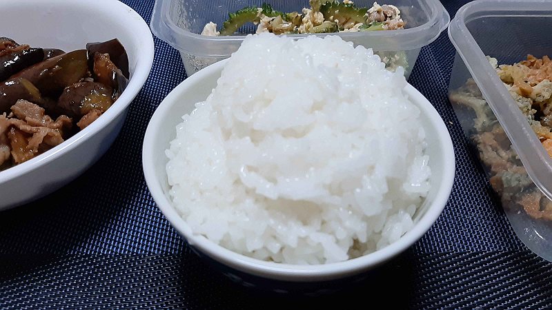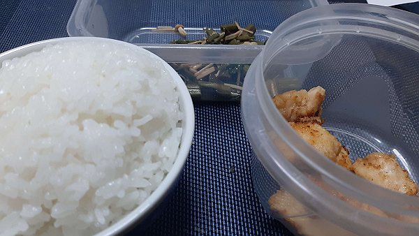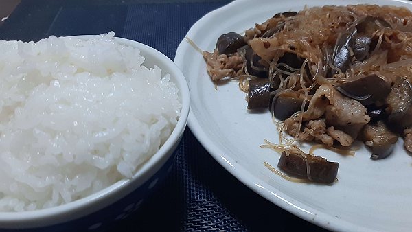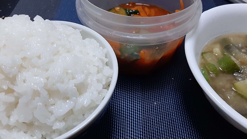 夜はなすの炒め、昨日の胸肉の唐揚げ、オイキムチを食べました。
