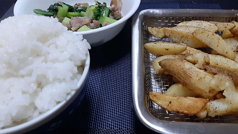 夜はチンゲン菜と豚肉の炒め、フライドポテトを作って食べました。