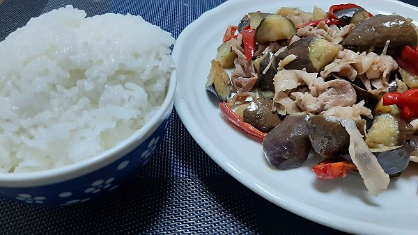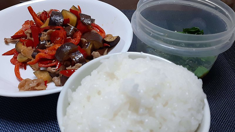 夜は豚肉となすと赤ピーマンの炒めを作って食べました。