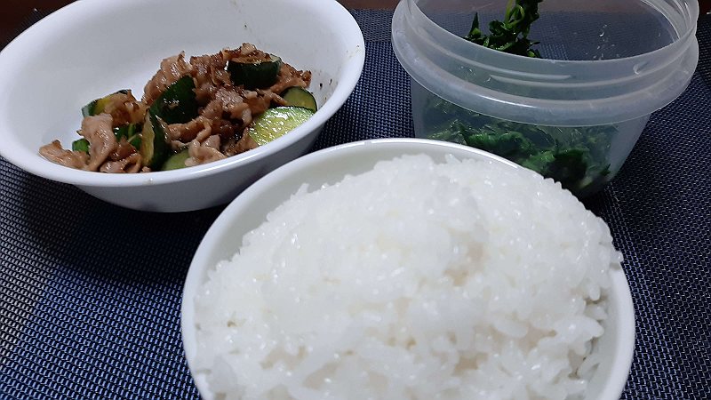 夜は豚肉ときゅうりの炒め、モロヘイヤのおひたしを作って食べました。