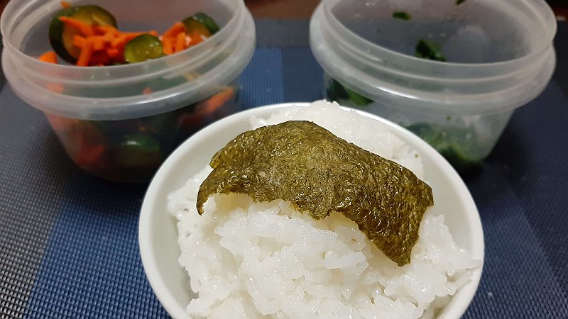 夜は豚肉が解凍できなかったのでオイキムチ、昨日のモロヘイヤのおひたし、海苔を食べました。