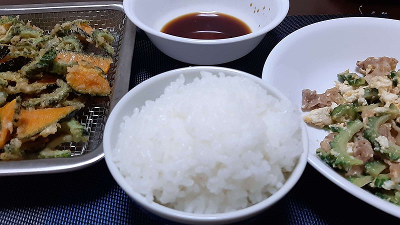 夜はゴーヤーとかぼちゃの天ぷら、ゴーヤーチャンプルーを作って食べました。