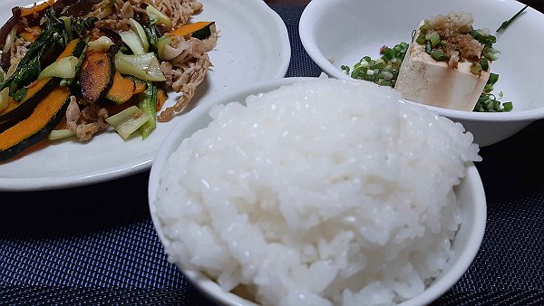 夜は豚肉ときくらげとちんげんさいとかぼちゃの炒め、冷奴を食べました。