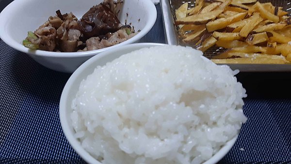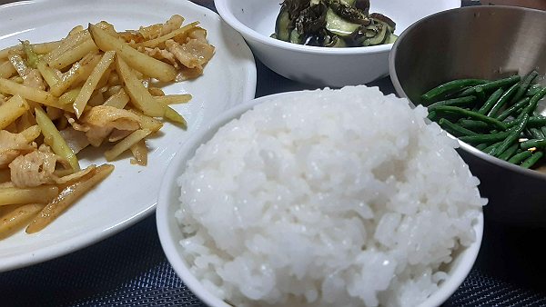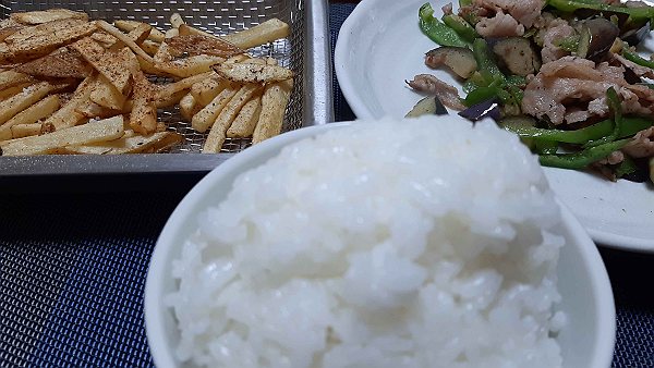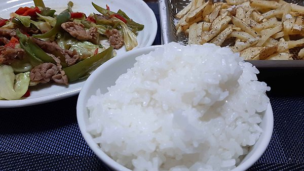 夜は豚肉とピーマンの炒め、フライドポテトを作って食べました。