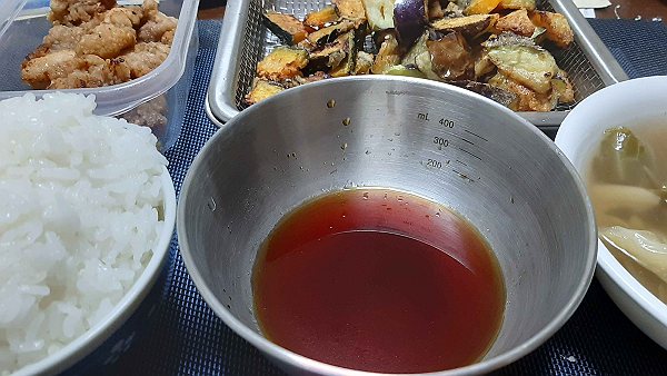 夜は天ぷら、昨日の唐揚げ、キャベツのコンソメスープを食べました。