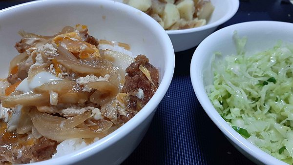 夜は昨日のカツでカツ丼、粉吹き芋、キャベツとピーマンのオリーブオイルサラダを作って食べました。
