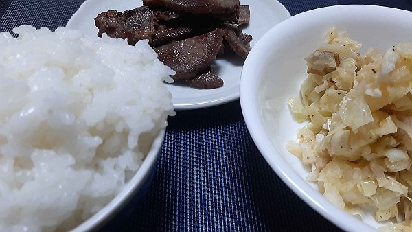 夜はお勤め品の牛タン、キャベツとじゃがいもとゆで卵のサラダを作って食べました。