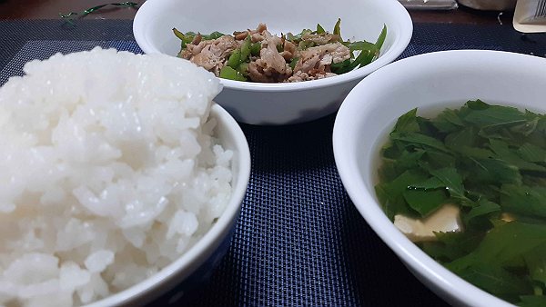 夜は豚肉とピーマンの炒め、モロヘイヤと豆腐のコンソメスープを作って食べました。