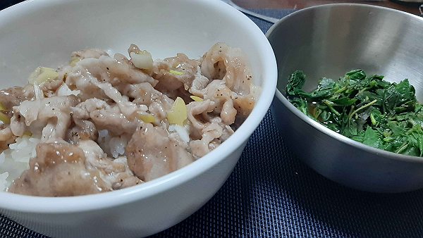 夜は豚肉かぼす丼、モロヘイヤのおひたしを作って食べました。