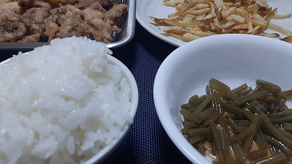 夜は唐揚げ、フライドポテト、いもづるのお煮付けを作って食べました。