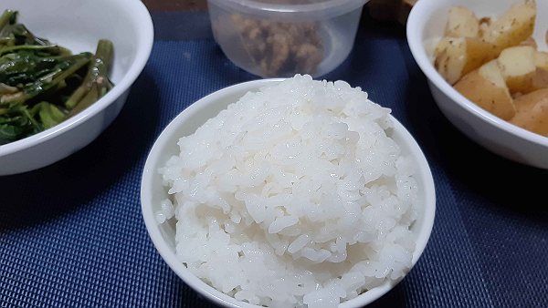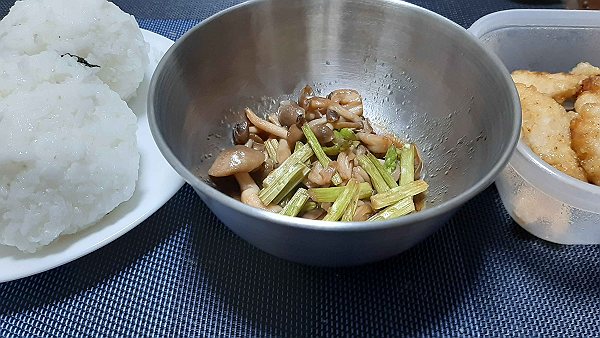 夜はおにぎり、アスパラガスとしめじのお煮物、昨日の唐揚げを食べました。