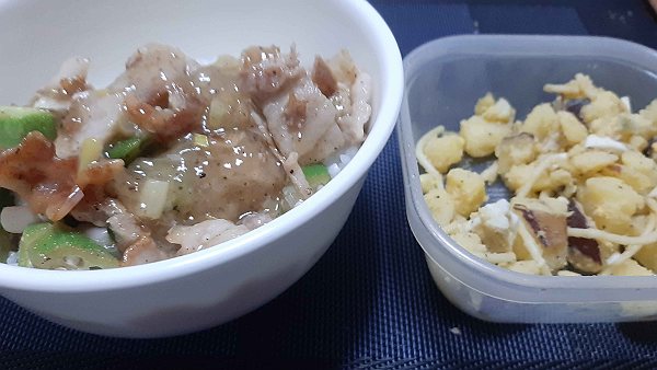 夜は豚かぼす丼、スパゲッティサラダを食べました。