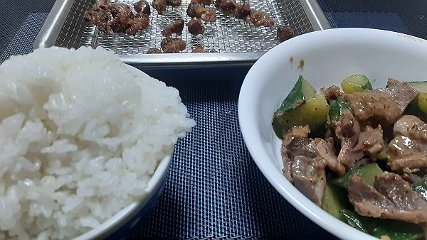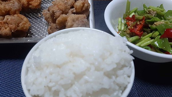 夜は唐揚げ、ピーマンと空芯菜の炒めを作って食べました。唐揚げはオールスパイス、にんにく、生姜、砂糖、塩、胡椒で付けてやったら、ケンタッキーのような味になりました。
