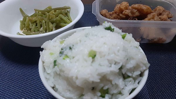 夜はいもづるのナムル、昨日の唐揚げ、だいこんぱご飯を作って食べました。