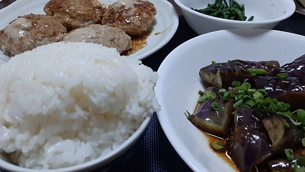 夜はハンバーグ、ナスの煮浸し、ササゲのおひたしを作って食べました。